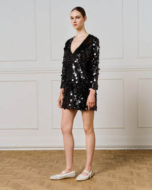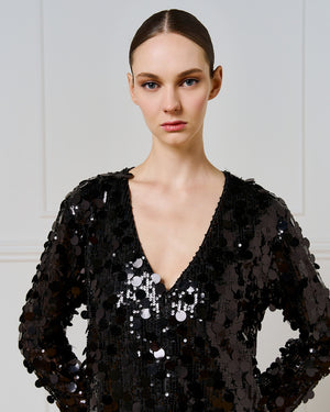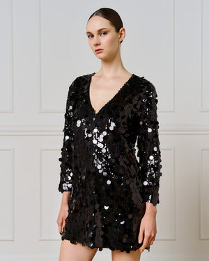 This ACCESS fashion black mini dress is a dazzling piece designed for glamorous occasions. Crafted with an all-over sequin embellishment, it catches the light beautifully, ensuring a bold and striking presence. The dress features a flattering V-neckline with a discreet zipper closure, adding both allure and functionality. Long sleeves balance the short length, while the inner lining ensures comfort and a smooth fit against the skin. Elegant yet daring, this mini dress is perfect for formal events, evening parties, or any occasion where a stunning, head-turning look is desired.