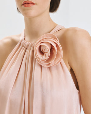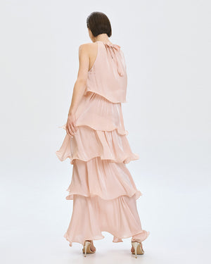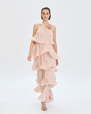 This maxi dress features an elegant halter neckline with a delicate tie closure at the back, creating a refined and feminine silhouette. Crafted from a lightweight fabric with a subtle glossy finish, it flows beautifully with every movement. The design is enhanced by cascading ruffle layers throughout the length of the dress, adding volume and soft texture, while a decorative fabric flower at the neckline provides a romantic focal point. Perfect for special occasions, this statement piece combines graceful detailing with an effortlessly fluid fit. Composition: 100% polyester.