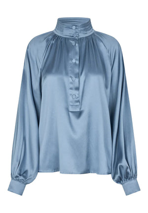 Multiple lines of stitching run through the high stand collar and down the half placket of this relaxed fit raglan sleeved blosue. The pale blue silk fabric and covered buttons add an air of elegance.
