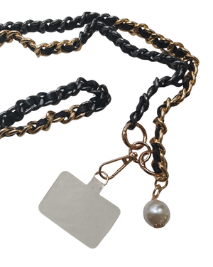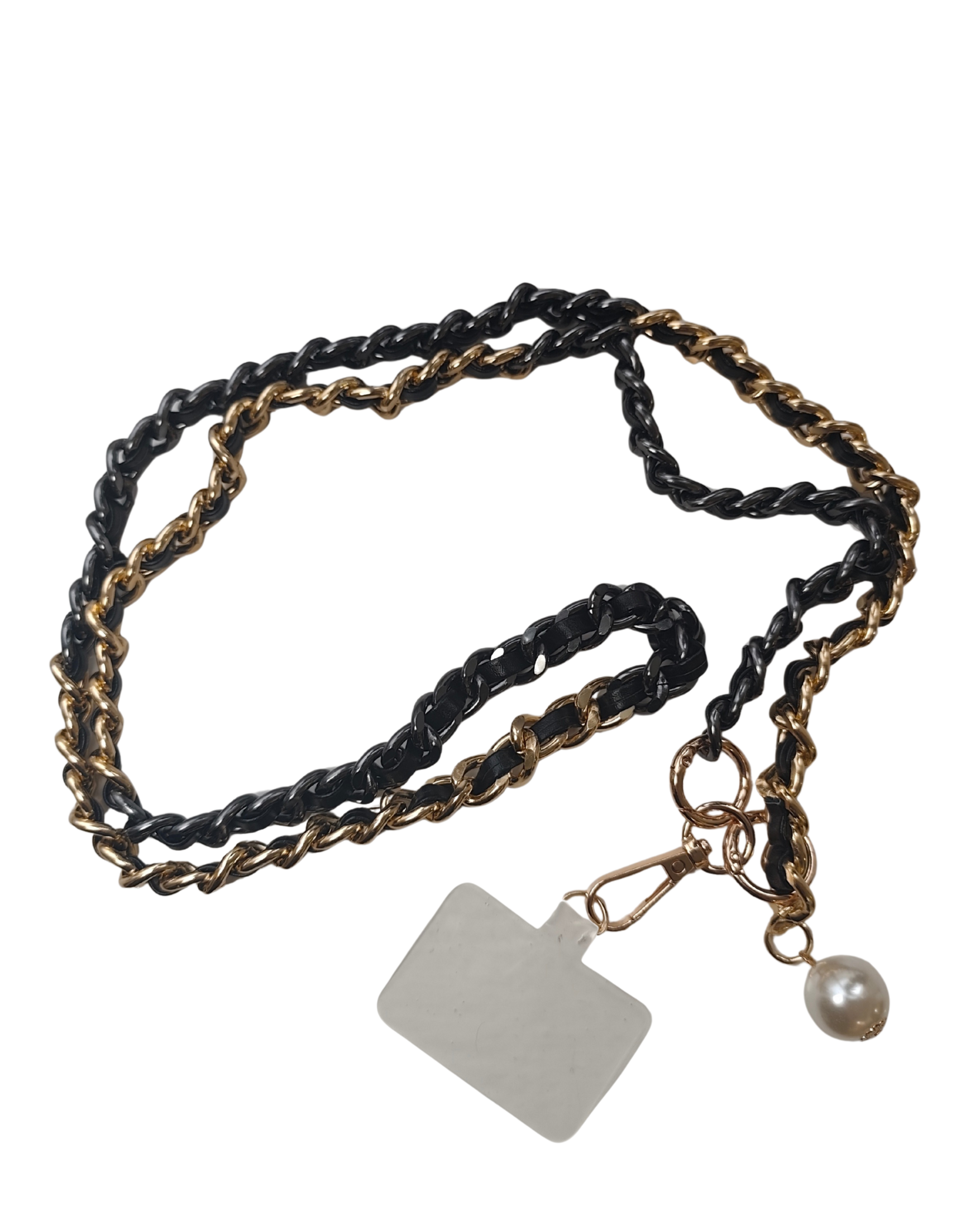 This phone holder is a stylish crossbody chain strap designed to carry a smartphone hands-free while adding a fashionable touch to any outfit. It features a dual-tone chain made of interwoven black and gold links, giving it a chic, luxury-inspired look similar to designer handbag straps. At the end of the chain, a set of gold rings connects to a gold lobster clasp, which attaches to a flat rectangular tab inserted inside the phone case for secure support. A single pearl-like charm hangs beside the clasp, adding an elegant and feminine accent. When worn, the chain drapes across the body and holds the phone—shown with a black glitter case—making the accessory both practical and stylish for everyday use.