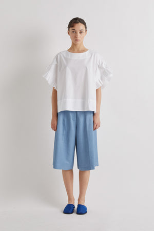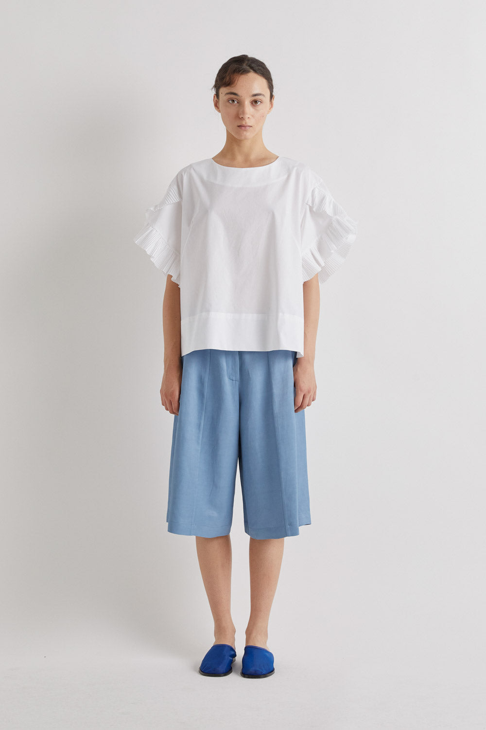 • This Meimeij top is a crisp, contemporary piece that combines clean lines with soft feminine detail. Crafted in smooth white fabric, it features a relaxed, boxy silhouette with a wide round neckline and a straight hem that sits loosely on the body. The standout detail is the short sleeves, finished with delicate pleated ruffle panels that add light texture and movement while keeping the overall look refined. Minimal yet distinctive, the top balances structure and softness, making it an easy-to-style piece that works effortlessly with tailored trousers or fluid skirts for a modern, polished look.