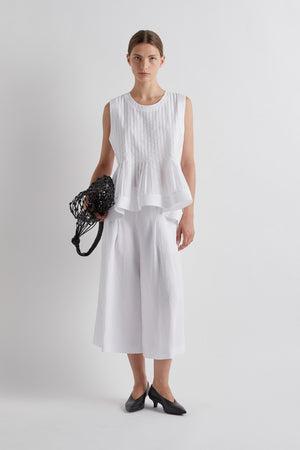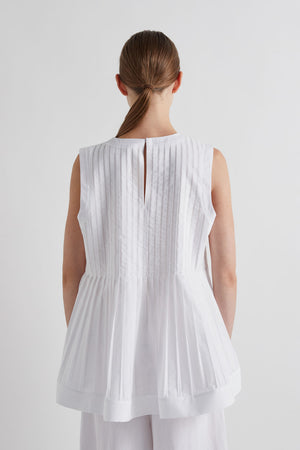 • This Meimeij top is a sleeveless white design that blends crisp tailoring with soft, sculptural movement. It features a round neckline and a fitted, vertically pleated bodice that adds subtle texture and structure, gently shaping the upper body. Below the bust, the top flares into a light peplum-style hem with fine pleats that create volume and fluidity without feeling heavy. Cleanly finished with a slightly extended hemline and a neat back slit at the neckline, it embodies Meimeij’s refined, modern aesthetic—minimal yet feminine, and effortlessly elegant when paired with wide-leg trousers or tailored separates.