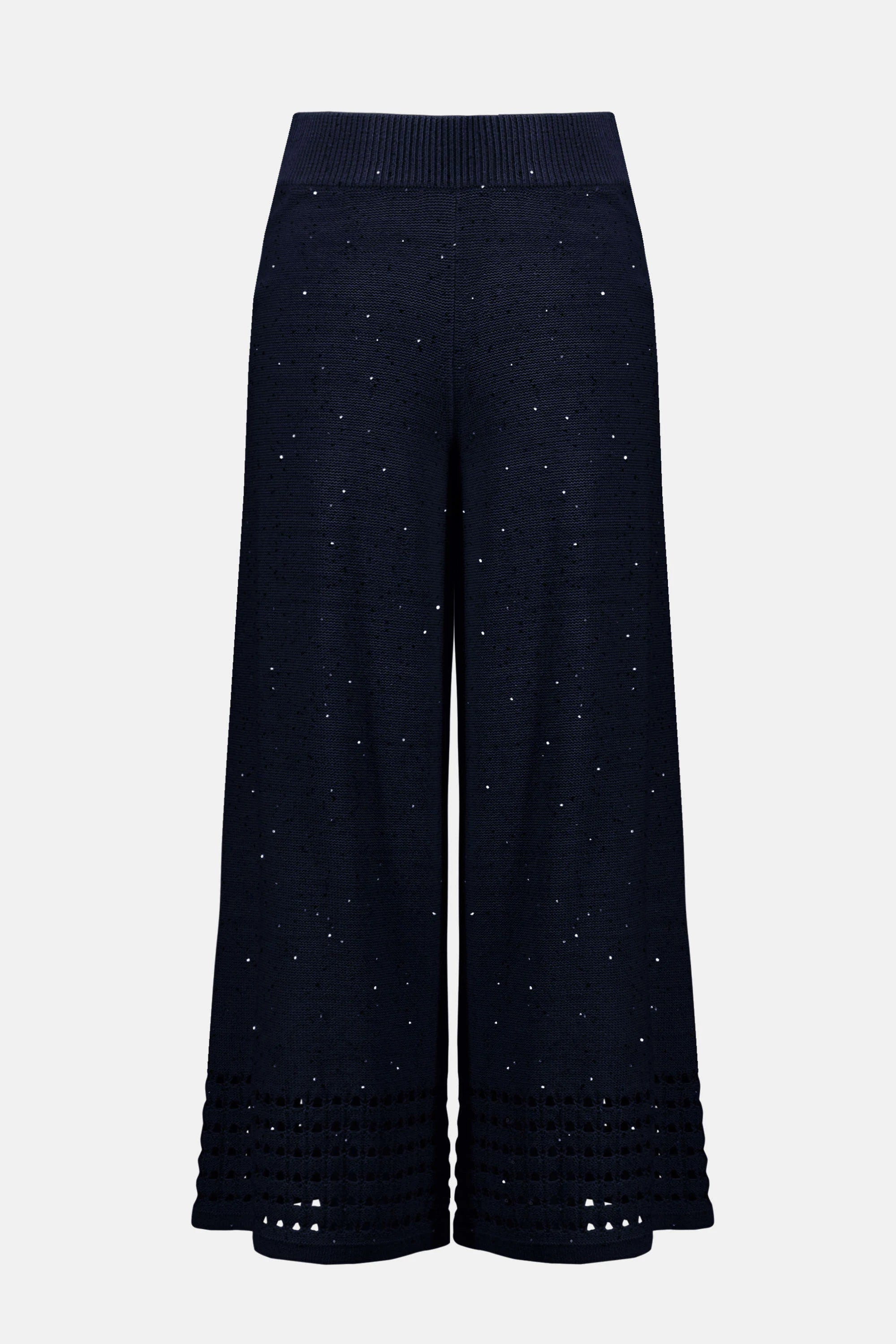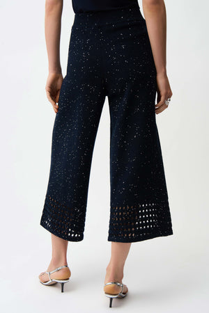 These cotton blend sequins yarn culotte pants feature a reverse jersey stitch with an open stitch border at the hem. The inserted elastic waistband ensures comfort while adding a touch of texture to this unlined, casual piece.
