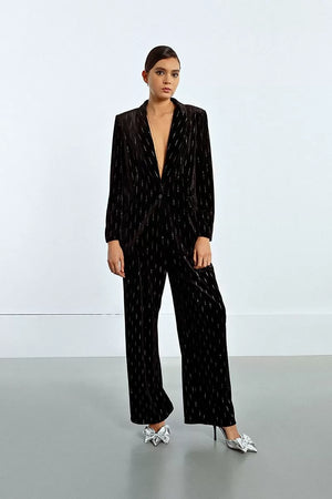This sophisticated Lili Sidonio blazer is crafted in luxurious velvet, embellished with discreet rhinestone detailing that adds a touch of sparkle to its refined silhouette. Designed with a straight fit, it features a classic tailored collar, a single-button closure, and front flap pockets for a timeless yet modern look. The soft velvet texture contrasts beautifully with the shimmering rhinestones, creating a chic balance of elegance and glamour. Perfect for evening occasions, it can be paired with matching trousers for a bold statement outfit or styled separately for versatile sophistication.