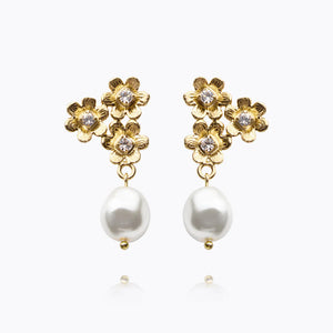 The Caroline Svedbom Juni Earrings are a beautifully romantic design that blends timeless elegance with a feminine touch. Each earring features a trio of delicate gold-tone flowers, each centered with a sparkling crystal that adds a subtle yet eye-catching brilliance. From the floral cluster hangs a lustrous white pearl drop, creating graceful movement and a classic contrast to the golden blooms. The combination of shimmering crystals, soft pearls, and intricate floral detailing makes these earrings both statement-making and versatile. Perfect for weddings, evening events, or simply elevating everyday outfits, the Juni Earrings capture a balance of sophistication and charm, embodying Caroline Svedbom’s signature style of modern luxury with a timeless feel.