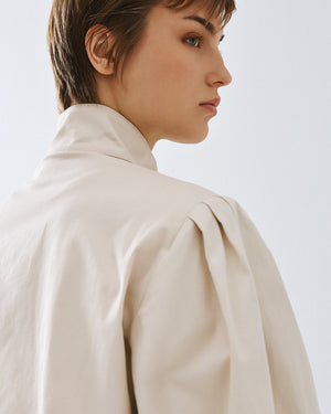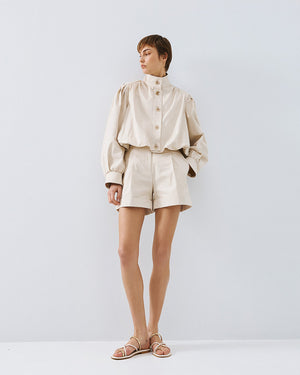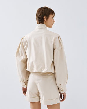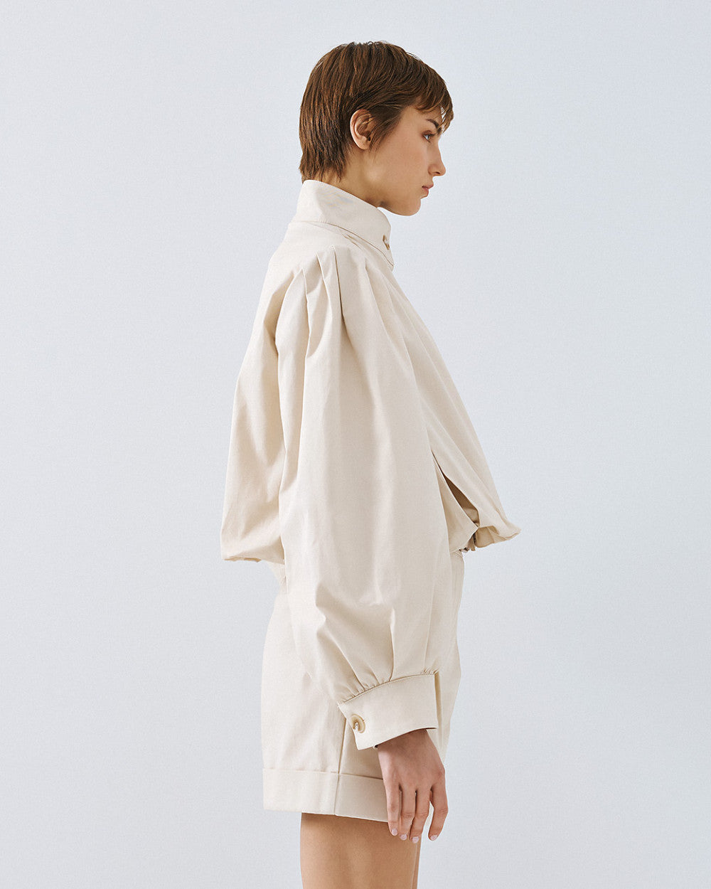 This bomber jacket is a modern, statement piece that blends structured tailoring with soft volume. Crafted from a comfortable cotton blend of 97% cotton and 3% elastane, it offers a smooth feel with gentle stretch for ease of movement. The design features a high neckline and padded shoulders that add definition, while puffed sleeves with pleated detailing create a bold, contemporary silhouette. A balloon hem enhances the cropped shape, giving the jacket a relaxed yet refined finish. Complete with practical side pockets and button closures at the front and cuffs, it pairs effortlessly with the matching shorts from the collection for a coordinated, fashion-forward look.
