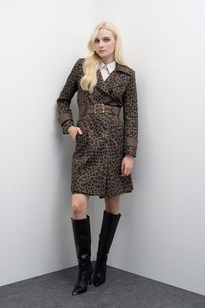 The coat in the image is a leopard print trench-style coat from Goagoa. It features: