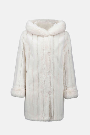 Wrap yourself in unparalleled comfort with our faux fur hooded jacket—so irresistibly soft and warm, you’ll never want to take it off. Designed for versatility, this reversible piece features a plush attached hood to keep the chill at bay, a button-front closure, and practical front pockets. Fully lined for added coziness, this above-the-knee coat is a luxurious must-have for your winter wardrobe.