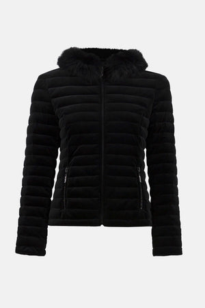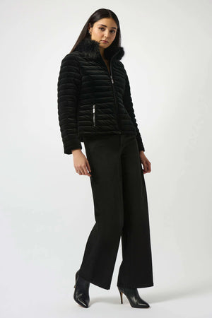 Joseph Ribkoff Black Stretch Velvet Puffer Jacket with Faux Fur Collar