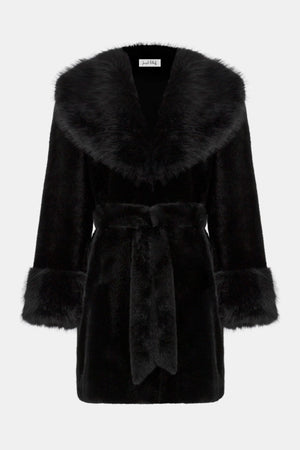 • Embrace the plush elegance of faux fur with this fitted coat, featuring a luxurious long-hair shawl collar and cuffed sleeves. A belted snap-front closure enhances its chic appeal, while side pockets offer both style and convenience.