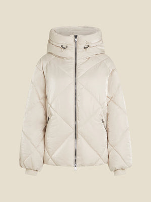 The Beaumont puffer jacket is a stylish and practical outerwear piece designed with an oversized, boxy silhouette and distinctive diagonal diamond quilting that adds both structure and modern flair. Crafted in a light beige, slightly glossy fabric with a subtle crinkled finish, it offers a chic yet versatile look that pairs effortlessly with both casual and dressier outfits. The jacket features a high padded collar with an attached hood and adjustable toggles, ensuring warmth and protection from the elements, while the full-length contrasting zipper and angled side zip pockets add both function and visual detail. Lightweight yet well-padded, it provides comfort and insulation without feeling bulky, making it a perfect choice for cold-weather layering.