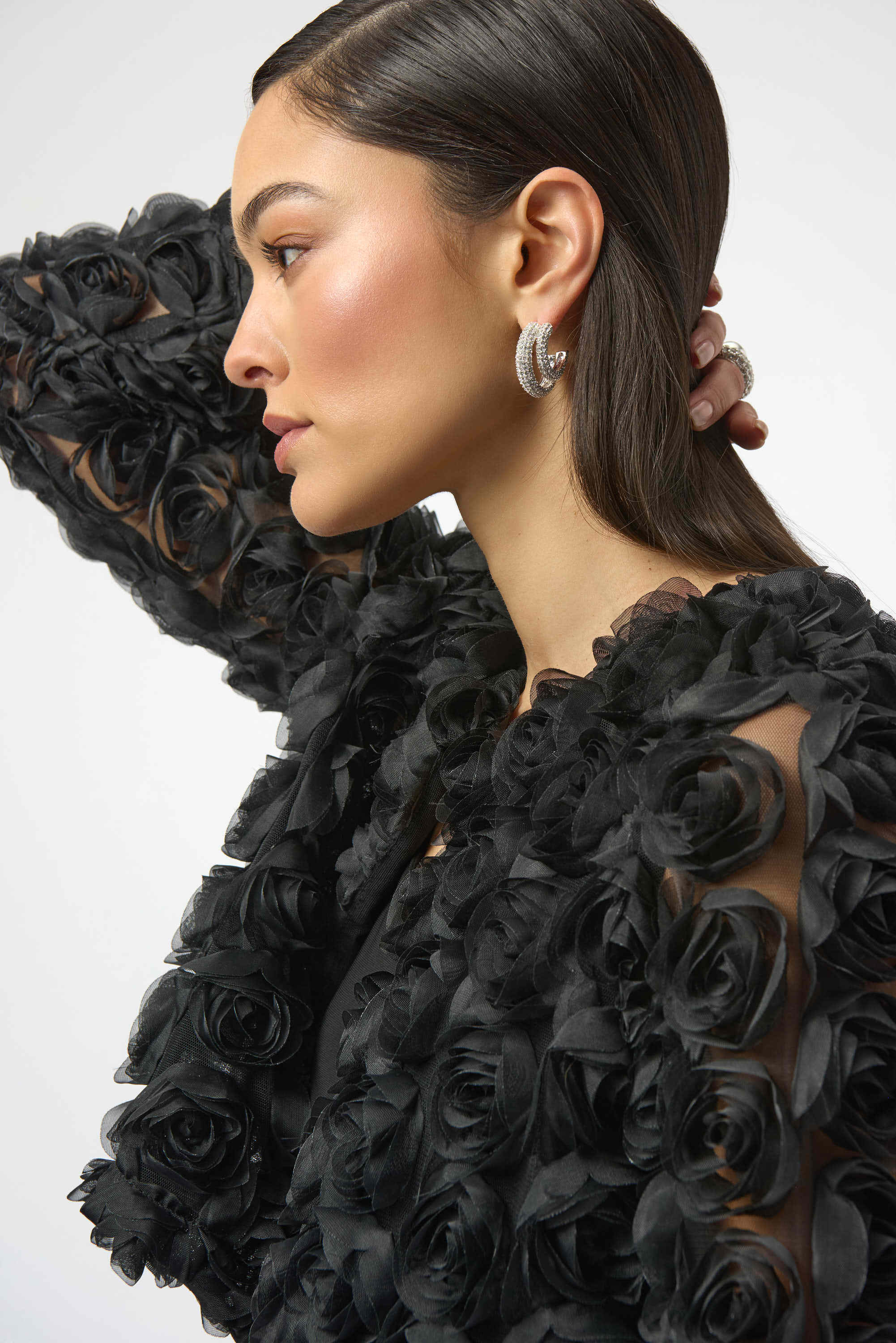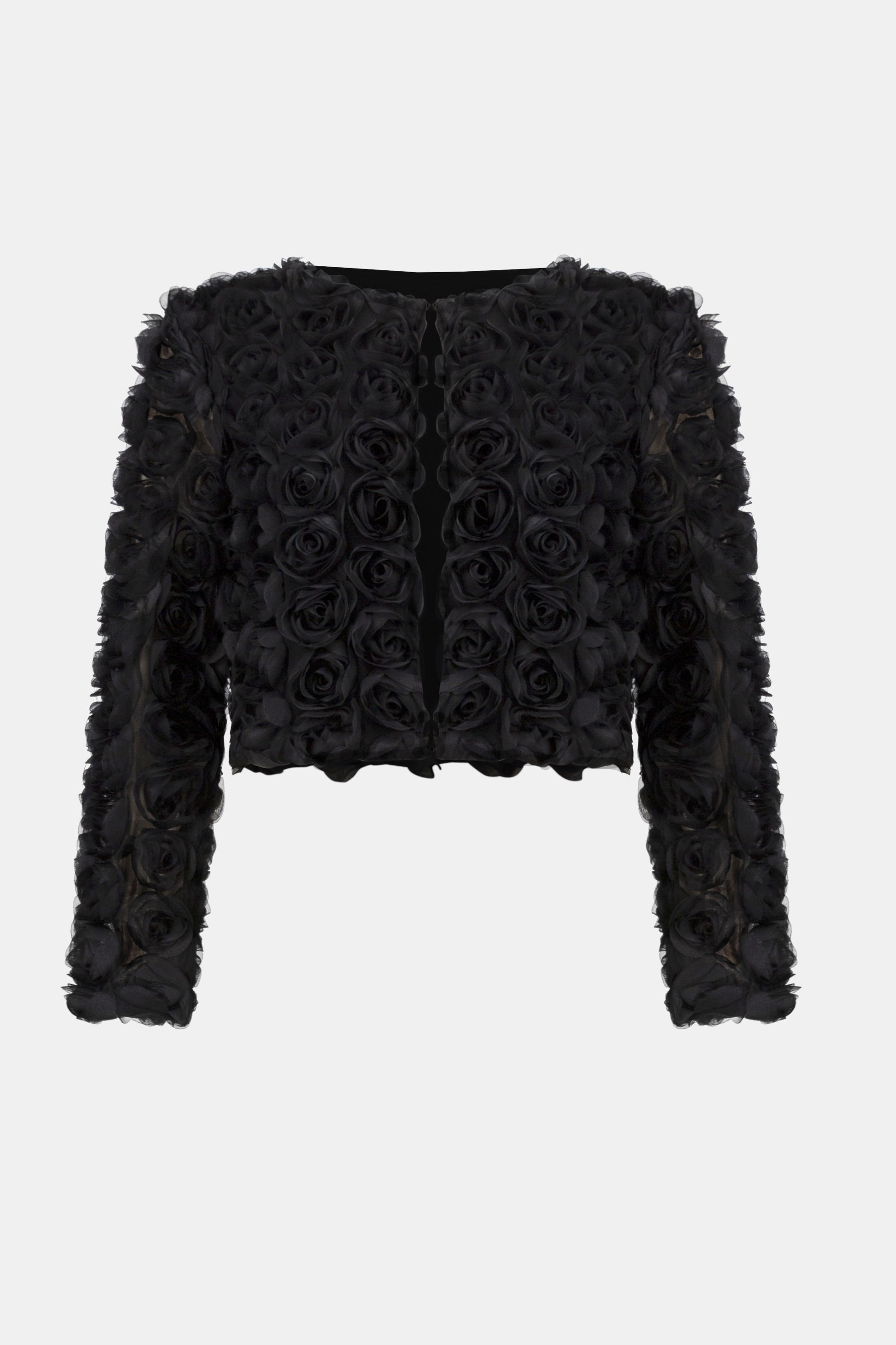 Elevate your occasion wear with this charming bolero jacket, adorned with all-over 3D woven roses for a feminine touch. Designed with long straight sleeves and a chic cropped fit, it pairs effortlessly with dresses or high-waisted dress pants for a polished look.