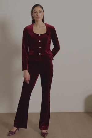 This retro-inspired blazer blends luxurious velvet, a flattering square neckline, and a fitted silhouette for an irresistibly chic look. Textured gold buttons and faux pocket flaps embellish the front, while princess seams elegantly define the waist for a sophisticated finish.
