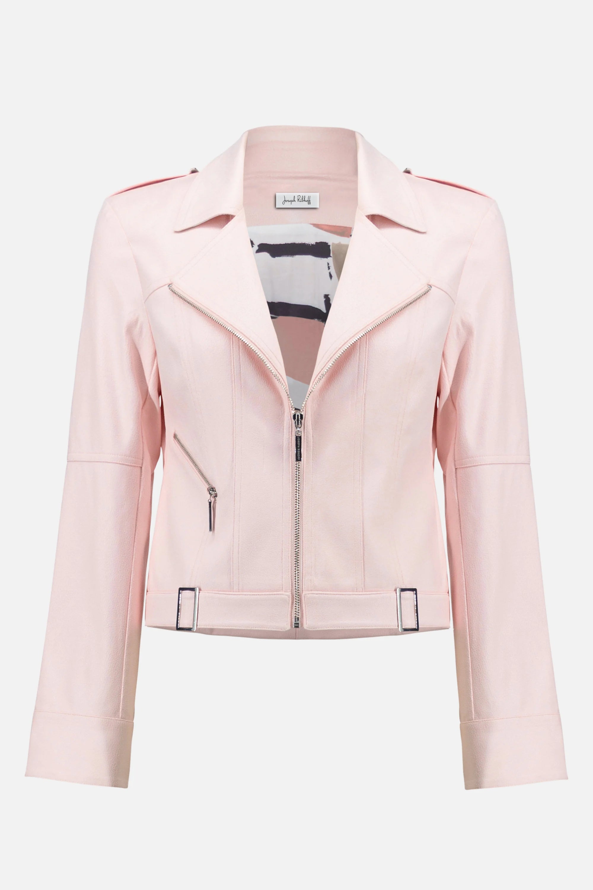 This foiled faux suede fitted jacket features a zip-front closure, faux pocket zippers, and snap cuffs. Decorative buckles at the front hem add a stylish touch, while the printed satin lining enhances its luxury feel.
