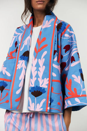 The RumiLL jacket is a true statement piece – a colourful artwork designed to bring creativity and personality into your wardrobe. Featuring large, hand-embroidered floral motifs in vibrant contrast tones, it creates a lively, bohemian-inspired expression that instantly elevates any outfit.