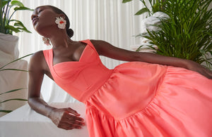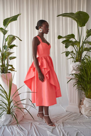 • Step into sophistication with the Corsica Pink Dress by Celia B — a striking statement piece designed to turn heads. Crafted for elegance and drama, this midi dress features a structured sweetheart neckline and wide straps for a flattering, feminine silhouette. The cinched waist enhances your figure, while the voluminous asymmetric ruffle skirt adds a touch of playful glamour.