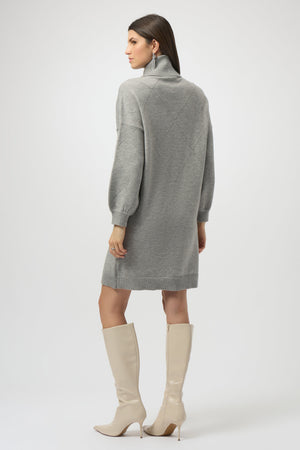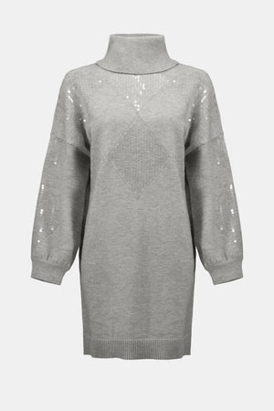 Cozy, feminine, and a little glam, this sweater knit dress has it all. Featuring long cuffed sleeves, a warm turtleneck, and a sleek straight silhouette for exquisite comfort, it’s elevated by a sequined diamond pattern on the front and sleeves for a shimmering touch.