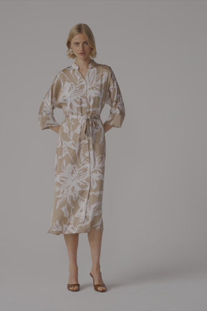 Joseph Ribkoff Beige/Vanilla Recycled Satin Floral Print Trapeze Shirt Dress With Sash