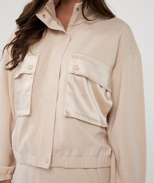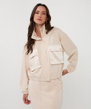 • The Cropped Modal Bomber Jacket from Esqualo combines laid-back style with luxurious comfort. Designed with a relaxed, boxy fit, it features long sleeves with elasticated cuffs, dropped shoulders, and a high stand collar for a modern silhouette. The elasticated hem creates a flattering cropped shape, while soft modal-blend fabric ensures an ultra-smooth, comfortable feel. Satin patch pockets add a subtle touch of sheen, and the front is finished with both a zipper and snap-button closure for versatile wear. Available in natural or black for effortless styling.