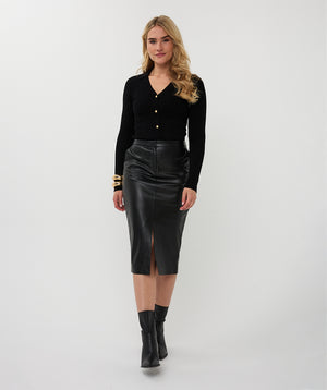 The Esqualo sweater in the image is a sleek and sophisticated piece with a modern, feminine touch. It is crafted in a fine ribbed knit fabric that offers both comfort and a flattering silhouette. The design features a deep V-neckline that elongates the neckline, complemented by a row of gold-toned buttons down the front, adding a polished and slightly dressy element. The long sleeves make it versatile for cooler seasons, while the fitted cut highlights the waist and creates a chic, streamlined look. Its minimalist black color enhances its versatility, making it easy to pair with tailored skirts, leather trousers, or casual denim for a range of styles from office-appropriate to evening chic. This sweater is a timeless wardrobe staple that balances elegance with everyday wearability.Made from a comfortable blend of 78% Viscose and 22% Nylon.