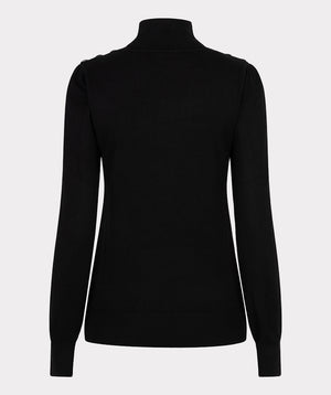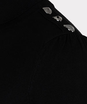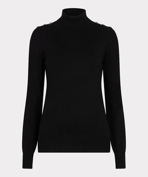 This chic, long sleeve knit top by Esqualo features a high mock turtleneck. Embellished by three gold toned buttons on each shoulder, adding a touch of elegance. The clean lines and classic design make it a versatile and sophisticated piece for any wardrobe.