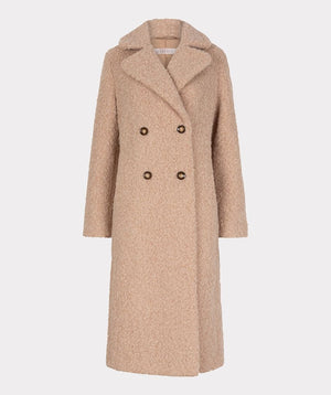 The Esqualo Manteau Long Bouclé Double Breast brings timeless elegance with a modern twist. Cut in a veston-inspired silhouette, it features a refined lapel collar and a double-breasted front adorned with marbled buttons. Crafted from soft, slightly stretchy boiled wool, this coat offers both comfort and structure.