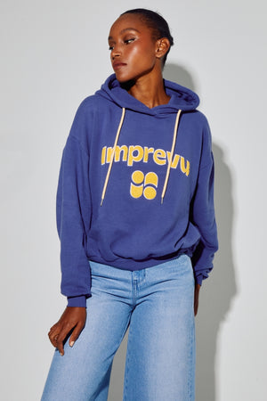 Crafted from lightweight, fluffy Italian fleece, it delivers exceptional softness and cozy comfort. The standout Imprevu terry cloth logo on the front adds texture and a vintage athletic feel, while the contrasting striped hood drawstring enhances its varsity-inspired look.