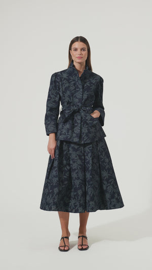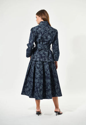 • Multi stitching adds an extra element of detail a it runs around the collar, cuff, placket and tie belt of this elegant flroal printed denim jacket. Slim fitting. It has 7/8 sleeves endingind deep cuffs gathering at the shoulder and welt pockets.