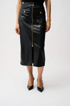 An emblem of timeless sophistication. The leatherette knit lends an irresistible feel to this chic pencil skirt. The piece features a bold two-way metal zipper closure and sleek flap pockets. The textured JR floral buttons and puller add a charming detail, while the front slit highlights the garment’s striking silhouette.