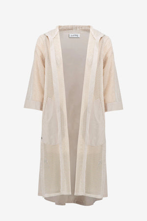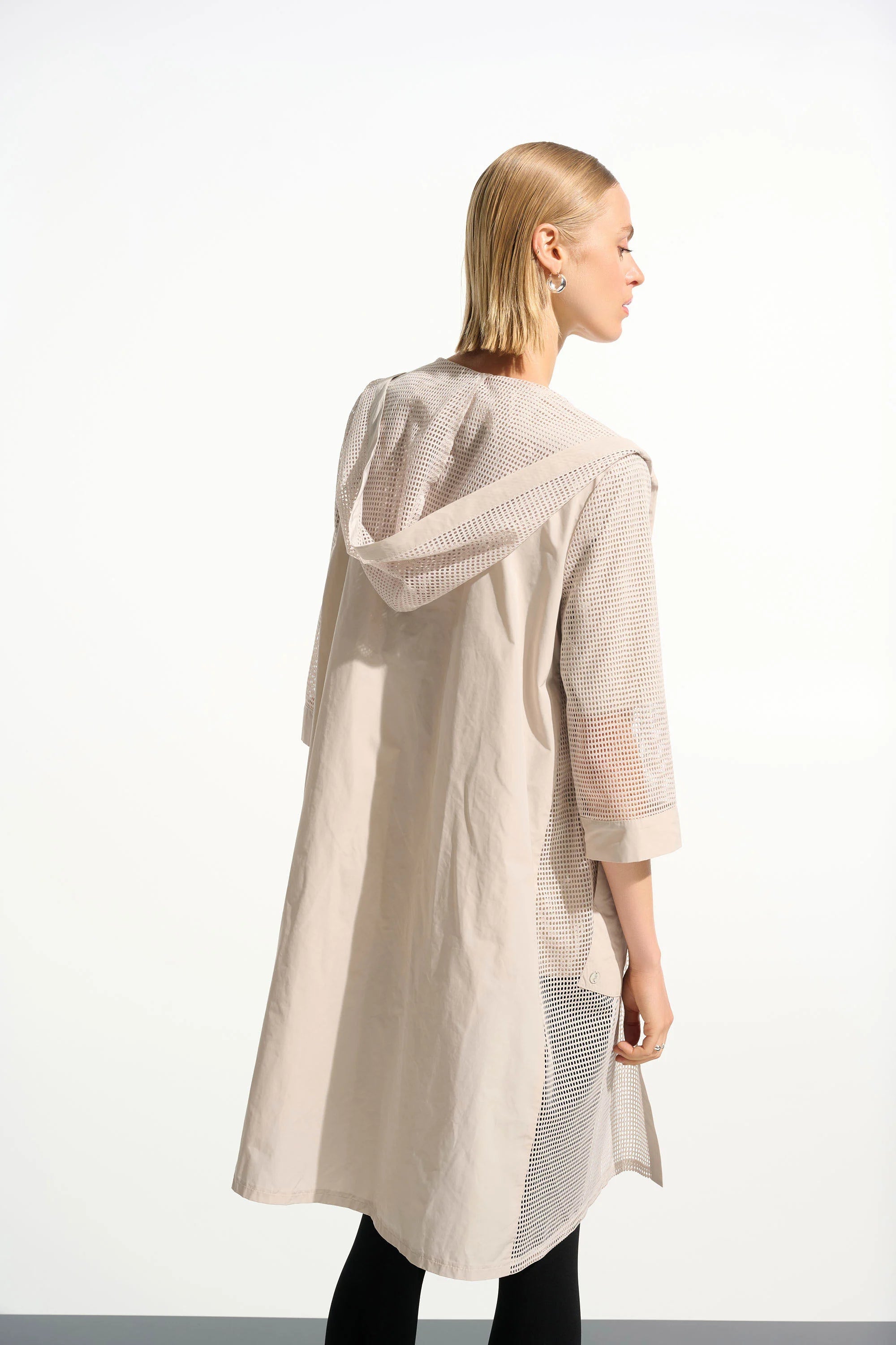 A casual cover-up with clever contrasts: smooth memory fabric meets airy mesh in this easy A-line silhouette. Finished with a hood, cuffed three-quarter sleeves for a relaxed, functional feel.