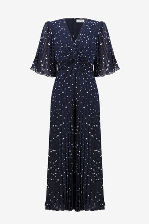 Elevated with dot print and soft pleats, this chiffon Wide Leg jumpsuit blends romantic flow with tailored shape. A knotted waist defines the silhouette, while flared sleeves and a clean back zip add refined ease. Part of the Signature collection.