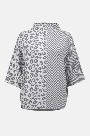This distinctive top combines bold style with cozy comfort, showcasing a playful mix of patterns—half animal print and half herringbone. Crafted from luxurious jacquard sweater knit, it features a funnel neck, a relaxed boxy silhouette, and roomy three-quarter dolman sleeves for an effortlessly chic look.