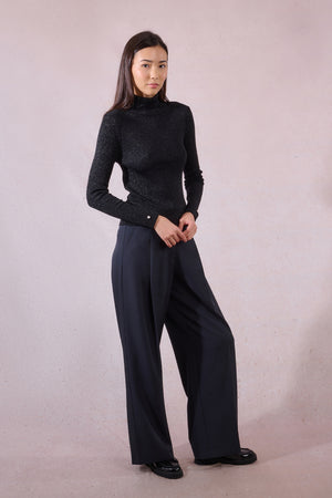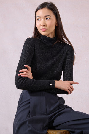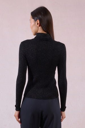 Add a pop of color to your wardrobe with this black slim-fit turtleneck crafted from a ribbed, iridescent knit that subtly shimmers in the light. Designed with long sleeves featuring rolled-up cuffs secured with a fancy button, it adds a touch of refined detail to a classic silhouette.