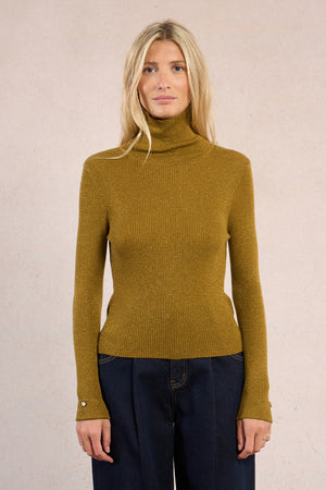 Add a pop of color to your wardrobe with this lime green slim-fit turtleneck crafted from a ribbed, iridescent knit that subtly shimmers in the light. Designed with long sleeves featuring rolled-up cuffs secured with a fancy button, it adds a touch of refined detail to a classic silhouette.