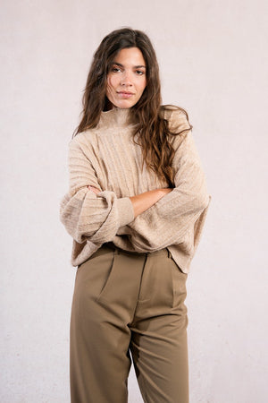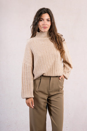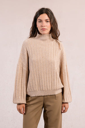 The Molly Bracken sweater is a stylish knit with a touch of sparkle, thanks to its subtle glitter insert woven into the fabric. Designed with long puffed sleeves and tightened cuffs, it balances volume and structure for a chic, modern look. The stand-up collar adds a cozy and elegant touch, while the short cut keeps the silhouette contemporary and easy to style with high-waisted bottoms. Measuring 53 cm from the shoulder in a size S, this sweater is perfect for creating both casual and dressy outfits with a hint of shimmer.