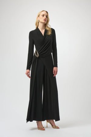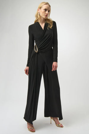 The wide-leg silhouette on this striking silky knit jumpsuit exudes undeniable glamour. The draped bodice, cinched by an oversized buckle ornament, accentuates the waist and adds a refined touch to the design.