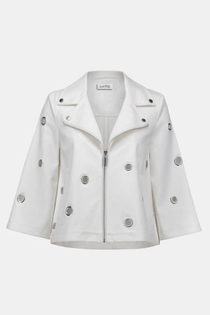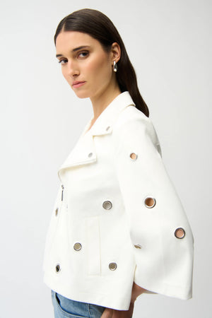 Crafted from foiled faux suede, this swing jacket features a chic notched collar and zip closure adorned with allover grommets in assorted sizes. The short sleeves and lined interior make it a perfect blend of style and comfort for any occasion.