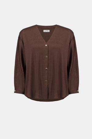 This crushed satin boxy top features a V-neckline and three-quarter dolman sleeves accented with a pleat and decorative buttons. A front button closure completes the design with a touch of understated polish.