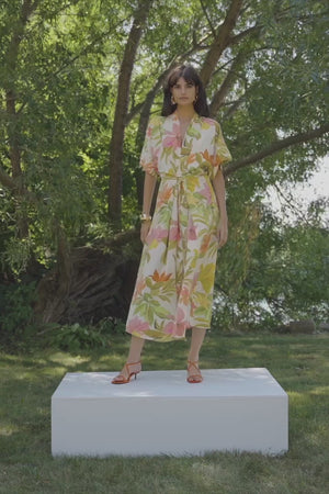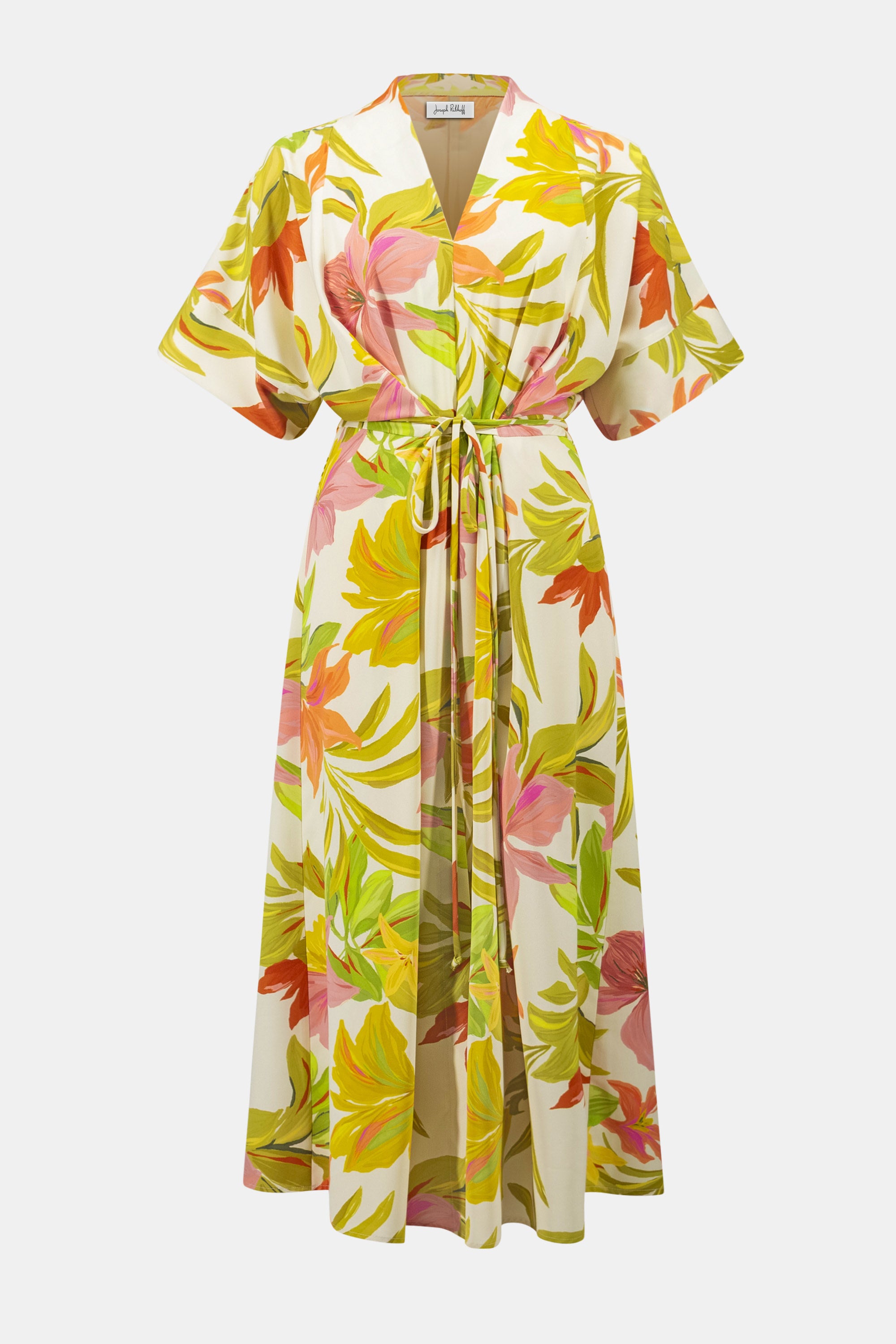 This recycled woven fit and flare dress showcases a vibrant tropical print with a flattering V-neckline. Short dolman sleeves with cuffs, a spaghetti cord at the waistline, and a front slit create a fluid below-the-knee silhouette.