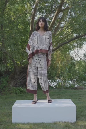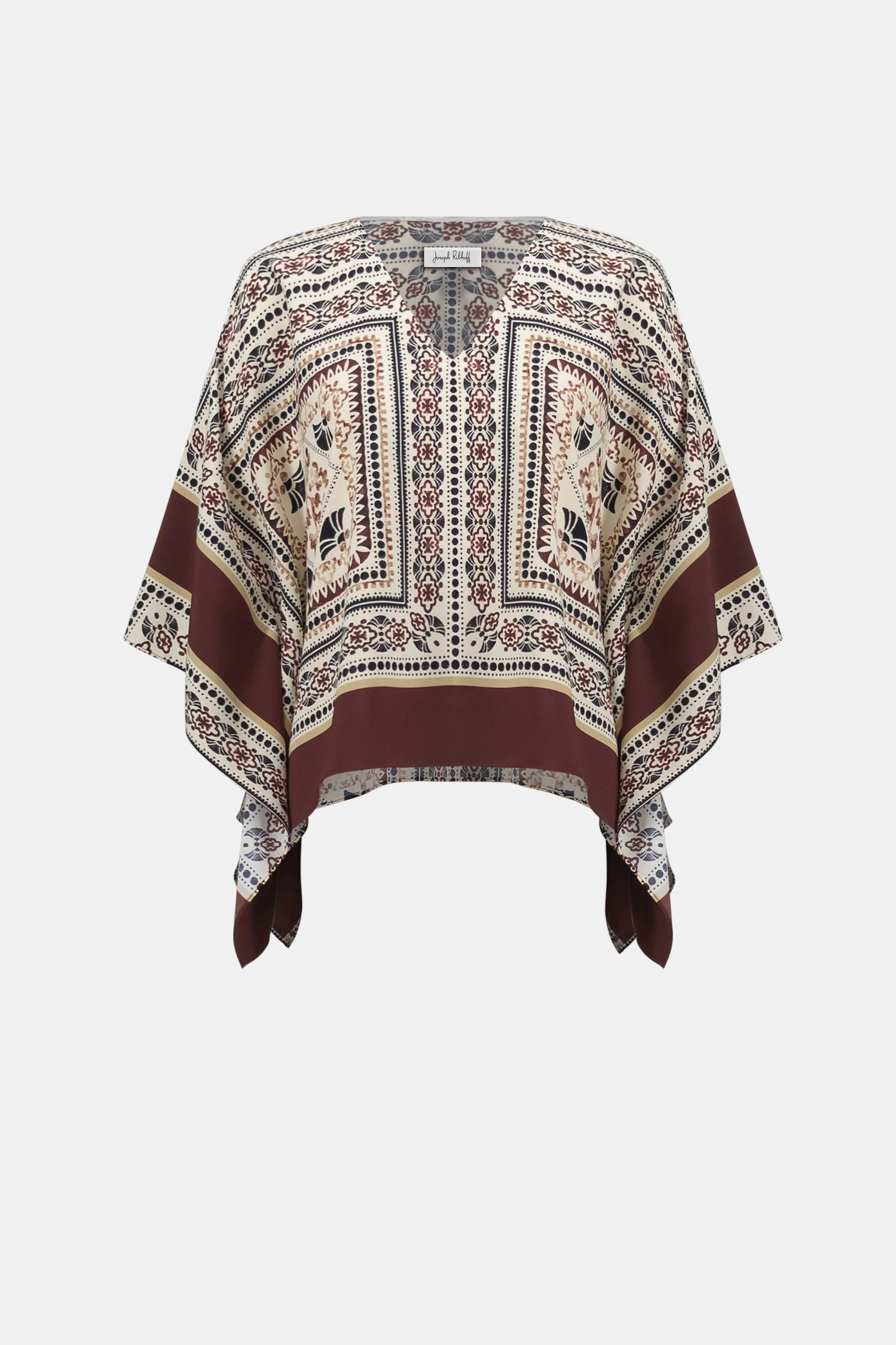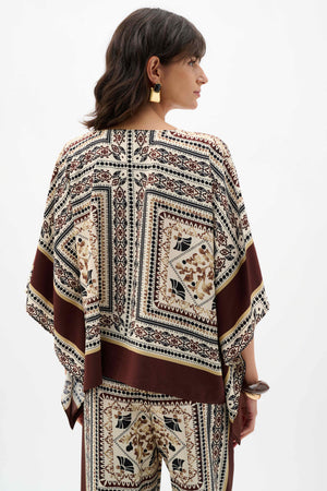 A lightweight, recycled woven poncho top featuring a scarf-inspired print. Designed with a V-neckline and three-quarter dolman sleeves, this unlined piece offers a relaxed, breezy fit.