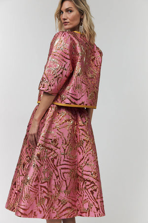• The TrineLL jacket is an elegant and festive statement piece designed to stand out. Crafted in a beautiful jacquard-woven fabric with a shimmering pink and gold pattern, it brings a luxurious touch to both everyday and occasion wear. The feminine silhouette is highlighted by yellow contrast trims and a delicate tie at the neckline, adding a playful yet refined finish.