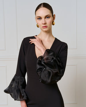 • Sleeves: Long with organza balloon cuffs