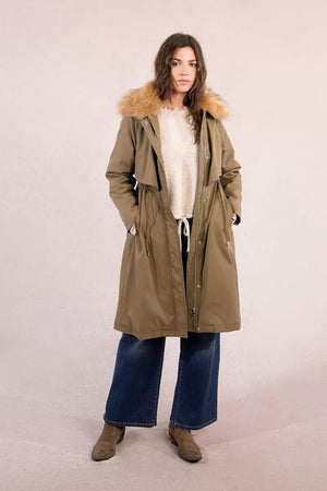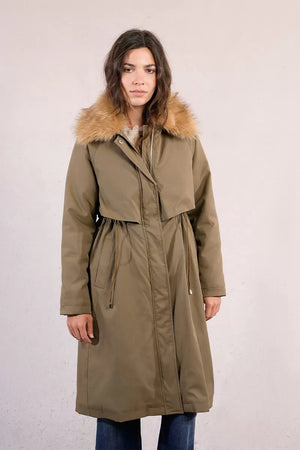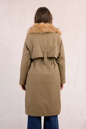 The Molly Bracken long parka is a timeless outerwear piece that combines practicality with style, making it perfect for cooler seasons. Designed with a length of 103 cm from the shoulder for a size S, it offers extended coverage to keep you warm and protected. The coat features a wide detachable faux fur collar that adds both comfort and a touch of sophistication, while giving you the option to adapt the look depending on the occasion. Functional details include side pockets for convenience, an adjustable waist with a sliding drawstring for a flattering fit, and a concealed front closure that ensures a sleek silhouette while protecting against wind and rain. Fully lined on the inside, the parka is crafted from 100% polyester, making it durable, weather-resistant, and easy to maintain. Its raincoat functionality further enhances its practicality, ensuring you stay stylish and comfortable even in unpredictable weather. This versatile piece can be paired effortlessly with casual denim or layered over more polished looks, making it a wardrobe essential for everyday wear.