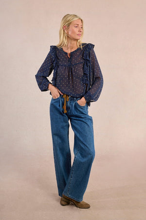 The Molly Bracken polka dot blouse is a chic and feminine piece crafted in a semi-transparent fabric that blends elegance with subtle allure. Designed with long balloon sleeves, finished with buttoned cuffs, it offers a touch of volume and refinement. Ruffled stripes frame the front sides, enhancing its romantic feel, while a round neckline with a covered button closure adds a polished detail. The gathers above the chest line create a soft drape, leading into a slightly flared cut that ensures comfort and ease of movement. Measuring 60 cm from the shoulder in a size S, this blouse is made from 100% polyester, making it both lightweight and versatile for pairing with jeans, skirts, or tailored trousers.