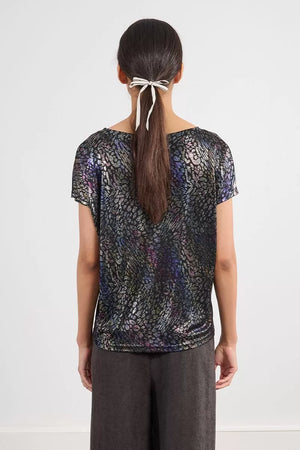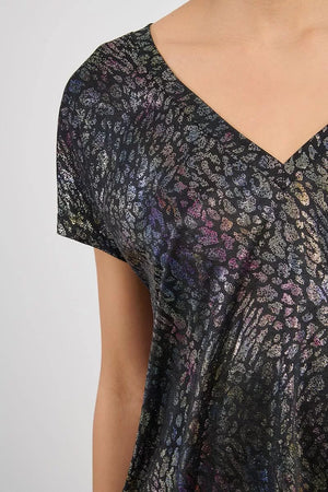 • The Molly Bracken top is a chic and versatile piece designed with a relaxed fit and a flattering V-neckline that adds a touch of femininity. Made from a lightweight fabric with a soft drape, it stands out for its metallic finish that creates a shimmering, eye-catching effect. The abstract leopard-inspired print features iridescent tones of purple, silver, and blue against a dark background, giving the top a modern yet elegant appeal. With its short sleeves and comfortable cut, it can be effortlessly styled for both casual and evening looks—pair it with jeans for a laid-back outfit or with tailored trousers or a skirt for a more polished, sophisticated ensemble.