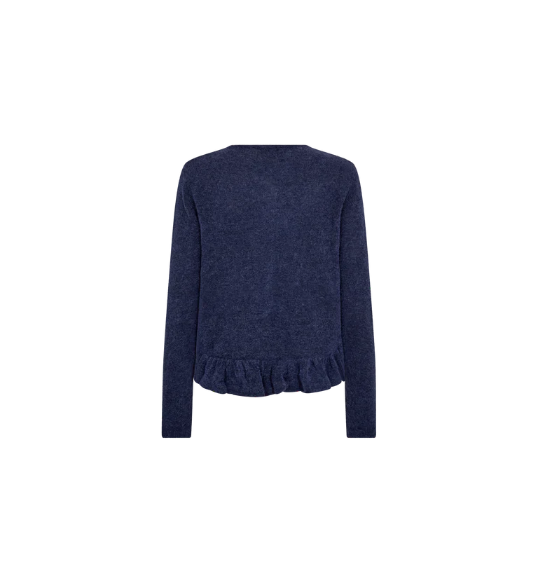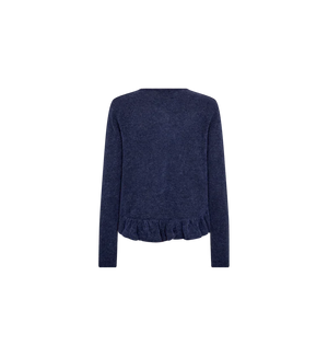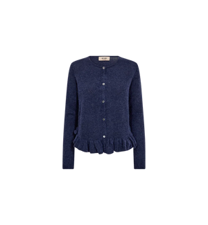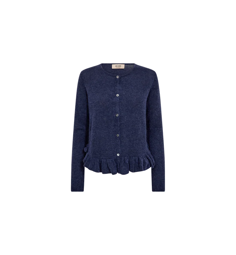 The Mos Mosh Mape Alice Knit Cardigan (Style 177560) is a soft and feminine layer crafted from a luxurious wool-blend that feels light yet cosy against the skin. Designed with long sleeves and a classic button-front closure, it features delicate frill detailing along the hem that adds subtle movement and texture. The flattering fit enhances its elegant silhouette, while the rich Crown Blue shade brings depth and versatility to everyday styling. Made from 35% polyamide, 31% wool, 14% certified mohair, 14% alpaca, and 6% elastane, it offers warmth, softness, and gentle stretch. Perfect for layering over simple tees or pairing with denim, this cardigan effortlessly elevates casual looks with a refined, feminine touch.
