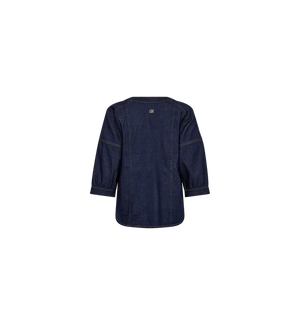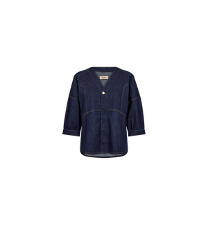 This Mos Mosh denim-inspired shirt offers a modern twist on a timeless silhouette, blending effortless style with refined structure. Designed in a regular fit, it features a flattering V-neckline with button closure and subtle panel detailing that enhances and shapes the figure. The rich dark blue wash is elevated by contrast stitching, adding depth and definition to the design. Slightly cropped sleeves lend a relaxed yet polished feel, making it a versatile piece that pairs seamlessly with matching denim for a coordinated look or styled with tailored trousers for a more elevated, contemporary finish.