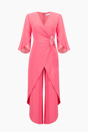 Fluid and striking, this silky knit culotte jumpsuit blends wrap-style elegance with flowy chiffon tulip sleeves. A Rhinestones ornament adds sparkle at the waist, while the tulip-leg silhouette creates graceful movement. Part of the Signature collection.
