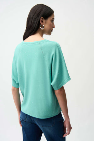 This viscose blend sweater combines sequins yarn with a relaxed fit and scoop neck design. The three-quarter raglan sleeves feature delicate pointelle details at the neckband and armhole seams, adding a touch of texture and elegance.