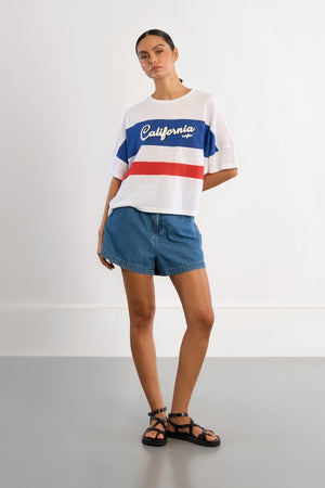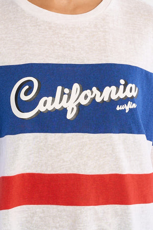 This California oversized T-shirt brings a relaxed and casual style with a retro-inspired graphic. Designed with a classic round neckline and mid-length sleeves, it offers a comfortable and easy-to-wear silhouette. The front features a bold “California surfin” print across contrasting blue and red horizontal stripes, adding a sporty and vintage touch to the design. Its oversized fit enhances the laid-back look, making it perfect for everyday wear. With a length of 55 cm from the shoulder for a size S, this T-shirt is crafted from a soft and breathable blend of 64% cotton and 36% polyester, ensuring comfort and durability throughout the day.